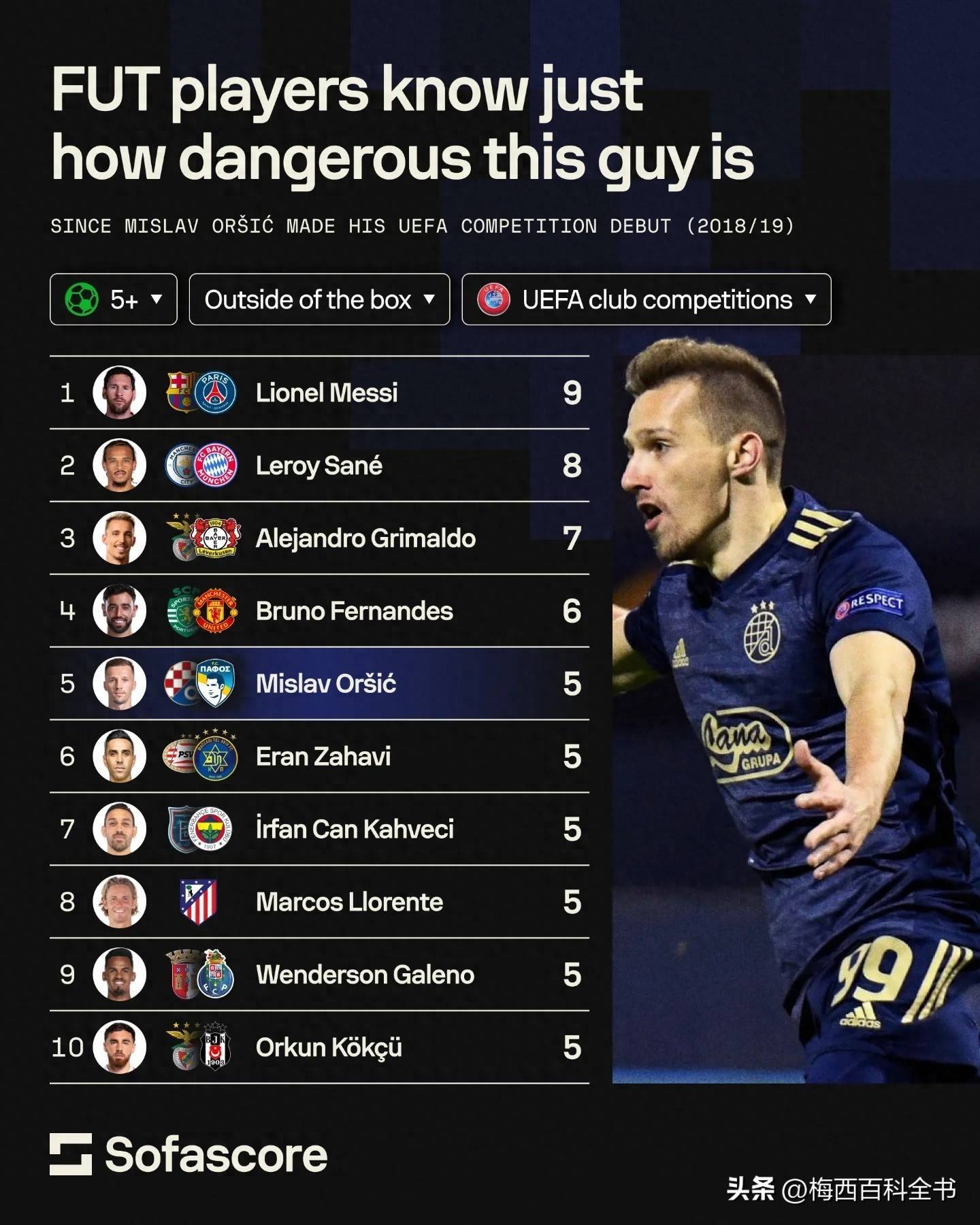 欧冠之王!过去8个赛季欧冠禁区外金靴:梅西!9个!